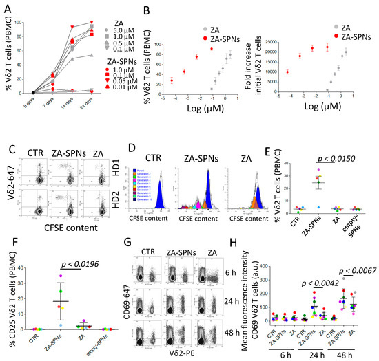 Due to the remarkable efficiency of ZA-SPNs, we further analyzed whether nanoformulated ZA, at the concentration of 0.05 µM (5 × 10−2 µM reported in Figure 1B), could trigger the proliferation of Vδ2 T cells, even without the addition of exogenous IL-2. Thus, PBMCs were labelled with carboxyfluorescein succinimidyl ester (CFSE), and on day 7 of the culture, proliferating Vδ2 T lymphocytes were identified using a double immunofluorescence assay, as cells with decreasing levels of CFSE content (green fluorescence intensity is inversely proportional to cell division rate) and reactivity with the anti-Vδ2 specific mAb. As shown in Figure 2C, a significant decrease of CFSE content in Vδ2 T cells was detected in ZA-SPNs cultures; in addition, an estimation of cell generations on day 7 showed that Vδ2 T cells incubated with ZA-SPNs had divided six to eight times, whereas cells treated with soluble ZA divided only one to two times (Figure 2D, ModFit LT analysis). At this time point, the percentage of Vδ2 T cells proliferating in ZA-SPN-stimulated cultures ranged from 20 to 35% in four out of five donors (Figure 2E); in contrast, no significant proliferation was detected with soluble ZA (Figure 2C–E) or empty SPNs (Figure 2E). This finding prompted the evaluation of whether ZA-SPNs could trigger the activation of Vδ2 T cells. It is well known that the neo-expression of activation antigens, such as cluster differentiation (CD) 25 and CD69, on T lymphocytes is a marker of cell triggering. Indeed, CD69 can function as a metabolic gatekeeper increasing glucose uptake [39], while CD25 is the α chain of the IL-2 receptor (IL2R) that increases the affinity for IL-2 of the βγ dimers of IL-2R [40]. Both these markers are involved in the growth of T lymphocytes [37,38]. CD25 expression on Vδ2 T cells, upon stimulation with ZA-SPNs, was detectable at 48 h, whereas no induction of CD25 was observed using soluble ZA or empty SPNs (Figure 2F). Neo-expression of the CD69 molecule on Vδ2 T cells was faster (detectable after 24 h) and stronger when PBMCs were incubated with ZA-SPNs compared to soluble ZA (Figure 2G,H). On the other hand, empty SPNs did not induce the expression of CD69 (not shown). Of note, the one donor whose Vδ2 T cells did not respond for proliferation (Figure 2E, light blue circle) also failed to express CD25 upon ZA-SPNs stimulation (Figure 2F, light blue circle). These data indicate that ZA carried by SPNs can deliver a strong activation signal to Vδ2 T cells, leading to the neo-expression of activation antigens and expansion in the absence of exogenous growth factors.