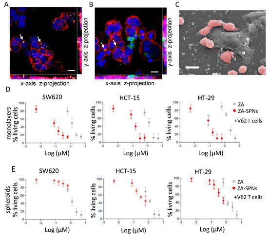 ZA-SPNs triggered the cytotoxicity of colorectal carcinoma (CRC) cell lines and spheroids using Vδ2 T cells. (A) Representative confocal microscopy image showing Cy5-conjugated ZA-SPNs’ (orange, arrows) internalization in CRC cells, identified using the anti-EPCAM mAb and Alexafluor555 isotype-specific goat antimouse (GAM) (red). Blue: nuclei diamidino phenylindole (DAPI) staining. Scale bar: 10 µm. (B) Vδ2 T cells identified using the specific anti-Vδ2 mAb and Alexafluor488-anti-isotype GAM (green) interacting with CRC (EPCAM followed by Alexafluor555 GAM, red) previously exposed (24 h) to ZA-SPNs (white arrows). Blue: DAPI nuclear staining. Scale bar: 10 µm. (C) SEM images of a similar experiment in which Vδ2 T cells (pink) had surrounded a CRC (gray). Scale bar: 20 µm. (D) The CRC cell lines SW620, HCT-15, and HT-29 were cultured adherent in flat bottomed plates with ZA-SPNs (red) or with soluble ZA (gray) at different concentrations and challenged with activated Vδ2 T cells from healthy donors at the effector:target (E:T) ratio of 3:1 for 48 h. Then, viability was assessed using a crystal violet assay. Data is expressed as a percentage of living cells as compared to cells cultured in medium alone, are the mean ± SD of three independent experiments of six different replicates for each condition. (E) Spheroids of the CRC cell lines SW620, HCT-15, and HT-29 at day 5 were incubated with activated Vδ2 T cells at the E:T ratio of 3:1 and either ZA-SPNs (red) or soluble ZA (gray) at the indicated concentrations for 48 h. Spheroid cell viability was assessed using crystal violet assay modified as described in Varesano et al. [45]. Data are the mean ± SD of three independent experiments of six replicates for each condition.