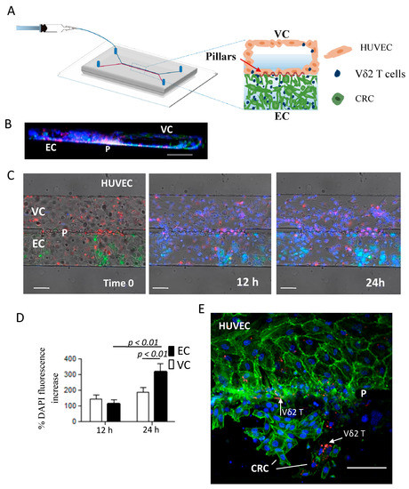 To test the ability of ZA-SPN-expanded Vδ2 T cells (i.e., Vδ2 T lymphocytes obtained from PBMCs upon stimulation with ZA-SPNs and further culture for 21 days) to extravasate and reach CRC cells, a double-channel microfluidic chip was used [50]. This device comprised a vascular compartment (VC), uniformly coated with human umbilical vascular endothelial cells (HUVECs), and an extravascular compartment (EC), hosting a Matrigel matrix with CRC cells. The two compartments were separated by an array of micropillars, equally spaced by 3 μm (Figure 6A). HUVECs were seeded and also grew on the micropillars area, realizing an authentic vascular bed (Figure 6A,B showing the 3D reconstruction). By using this microfluidic system, the dynamics of ZA-SPN-expanded Vδ2 T cells infused into the VC was monitored over time. In the time-lapse experiments, these Vδ2 T cells fluxed into the VC (visible in blue due to the nuclear staining) and were able to cross HUVEC monolayer (red, CM-Dil membrane staining), and through the array of pillars, infiltrate the Matrigel matrix and reach the tumor cells (green, GFP+) (Figure 6C).