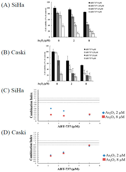 Effects of ABT-737 and As2O3 on cell viability in cervical cancer cells. (A) SiHa (5 × 103 cells/96 wells) were treated with different concentrations of ABT-737 (0, 1.25, 2.5, 5 μM) and As2O3 (0, 2, 8 μM) for 48 h. (B) Caski cells (5 × 103 cells/96 wells) were treated with different concentrations of ABT-737 (0, 1.25, 2.5, 5 μM) and As2O3 (0, 2, 8 μM) for 48 h. The data were expressed as mean ± SD. Significant differences were determined by one-way ANOVA. * p < 0.001, compared with cells without treatment; # p < 0.001, compared with As2O3 individually treated but no ABT-737 treated cells. (C) Combination index of ABT-737 combined with As2O3 on SiHa cancer cells. (D) Combination index of ABT-737 combined with As2O3 on Caski cancer cells.