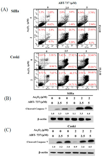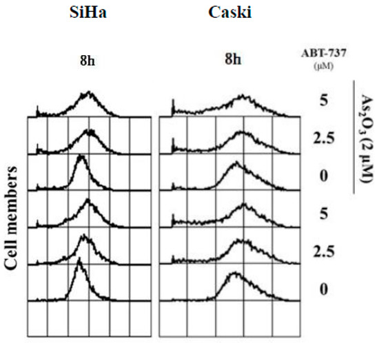The Caski and SiHa cells (2 × 105 cells) were seeded onto a 60 mm dish containing 5 mL of culture medium. The medium was removed after 24 h incubation, and 5 mL of fresh medium containing As2O3 and ABT-737 was added to the dish. The cells were used in investigating apoptosis after 48 h of treatment. Apoptosis was analyzed with fluorescein isothiocyanate (FITC)-labeled annexin V and propidium iodide (PI). A FITC-annexin V apoptosis detection kit I (BD Pharmingen™, San Diego, CA, USA; BD Biosciences, San Jose, CA, USA) was used.