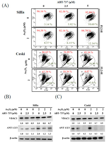 As shown in Figure 3A, MMP level was 7% reduced by ABT-737 in the SiHa cells but not by the combination treatment. Unlike in the SiHa cells, the combined treatment of ABT-737 and As2O3 markedly reduced MMP level in the Caski cells (Figure 3A). The voltage-dependent anion channel 1 (VDAC1) did not substantially change after the separate treatment of ABT-737 or As2O3 in the SiHa and Caski cells (Figure 3B,C). ABT-737 decreased As2O3-induced adenine nucleotide translocase (ANT) upregulation in the SiHa cells (Figure 3B). The amount of ANT was reduced after the separate treatment of ABT-737 in the Caski cells (Figure 3C). Furthermore, ANT reduction was promoted after the combined treatment of ABT-737 and As2O3 in the Caski cells as compared with that in separate treatments (Figure 3C).
