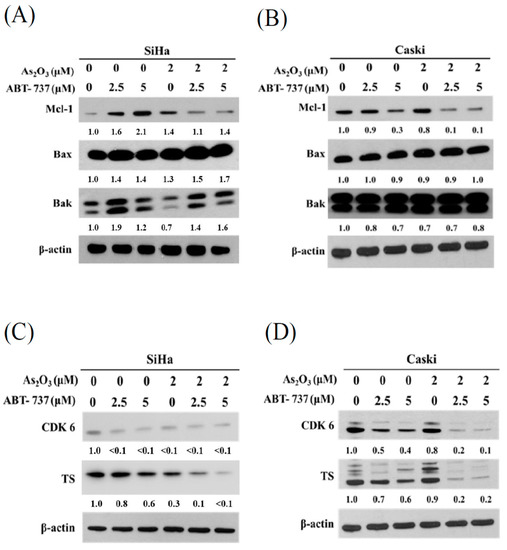 ABT-737 alone increased the expression levels of Mcl-1, and As2O3 alone decreased the ABT-737-induced Mcl-1 (Figure 5A). Unlike in the SiHa cells, ABT-737 alone reduced the expression levels of Mcl-1 in the Caski cells. Furthermore, the combined treatment remarkably decreased Mcl-1 expression in the Caski cells compared with the separate treatments (Figure 5B). The expression levels of Bax and Bak were not altered after the separate or combined treatments in both types of cancer cells (Figure 5A). CDK6 expression decreased after separate ABT-737 or As2O3 treatments in the SiHa cells (Figure 5C). The amount of TS in the SiHa cells was reduced by the combined treatment of ABT-737 and As2O3 (Figure 5C). The amounts of CDK6 and TS in the Caski cells progressively decreased as the dose of ABT-737 increased (Figure 5D). After the combined treatment of ABT-737 and As2O3, the performance of both proteins decreased as the dose increased (Figure 5D).