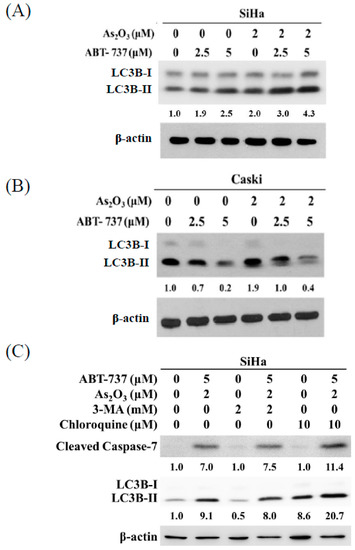 Autophagy is an anti-apoptosis mechanism [26]. The combined treatment of ABT-737 and As2O3 increased the LC3B-II/LC3B-I ratio, suggesting that autophagy was induced in the SiHa cells after the treatment (Figure 6A). However, ABT-737 decreased the ratio of LC3B-II/LC3B-I in the Caski cells (Figure 6B). Furthermore, the As2O3-induced LC3B-II/LC3B-I ratio decreased because of ABT-737 (Figure 6B). To evaluate the role of autophagy as induced by the combined treatment of ABT-737 and As2O3 in activating apoptosis, we used the autophagy inhibitors 3-MA and chloroquine to inhibit autophagy in the SiHa cells. As shown in Figure 6C, 3-MA partially decreased the LC3B-II/LC3B-I ratio induced by ABT-737 and As2O3. Compared with the combined treatment of ABT-737 and As2O3, chloroquine increased the accumulation of LC3B-II, suggesting that the combined treatment induced autophagic flux in the SiHa cells (Figure 6C). Both autophagy inhibitors increased cleaved caspase-7 in the SiHa cells. This result showed that the combined treatment induced anti-apoptotic autophagy in the SiHa cells.
