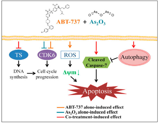 Mitotic signals stimulate CDK4 and CDK6 activities, which promote cancer cell proliferation through the entrance of G1 into the S phase in cell cycle [44]. Only ABT-737 cannot arrest cell cycle. However, As2O3 can induce G2/M arrest by p21 upregulation in acute promyelocytic leukemia [45]. CDK6 decreased after As2O3 was added for 72 h. Thymidylate synthase participates in cell DNA synthesis [46]. Suppression of TS reduces intracellular thymidine. As2O3 can reportedly suppress TS in 5-fluorouracil-resistant colorectal cancer cell line HT29 and assumes its use as a chemosensitizer in combination therapy [47]. Therefore, the reduced expression of CDK6 and TS results in cell cycle arrest and defect in DNA synthesis and leads to cell degradation and apoptosis [48].