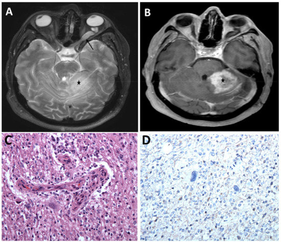 Optic pathway glioma and a high-grade cerebellar glioma in a young adult with NF1. (A) MRI brain, axial T2 sequence showing hyperintense left optic nerve lesion (arrow) and ill-defined hyperintense lesion within the left cerebellum (asterisk) associated with mass effect. (B) Post-contrast T1 sequence showing heterogeneous enhancement of the left cerebellar lesion concerning high grade neoplasm (asterisk). Histopathologic evaluation of the left cerebellar lesion was consistent with glioblastoma, WHO grade IV, IDH wild-type (C) Infiltrating glioma exhibiting atypical cells and vascular endothelial proliferation (H&E, 200×). (D) Tumor cells are negative for IDH1 (R132H) mutant protein (IHC, 200×).