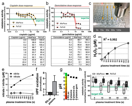 Dose-depended inactivation of pancreatic cancer cells through the application of cisplatin, gemcitabine, or physical plasma-conditioned Ringer’s lactate. (a,b) the metabolic activity of MiaPaca and PaTuS pancreatic cancer cells 24 h post-exposure to (a) cisplatin and (b) gemcitabine IC-25 target-line (green); (c) schematic overview of the standardized exposure of 100 µL Ringer’s lactate to the effluent of a kINPen argon plasma jet for 0, 15, 30, 60, and 120 s, and (d) the amount of hydrogen peroxide (H2O2) generated in this liquid; (e) metabolic activity of MiaPaca and PaTuS pancreatic cancer cells 24 h post-exposure to the respective physical plasma-conditioned Ringer’s lactate. Data are (a,b) mean ± SD and are representatives out of three independent experiments, (d) individual technical replicates with curve fitting of a quadratic function (R2 = 0.992) from three technical replicates; (e) concentration of nitrate and nitrite in plasma-conditioned liquid; (f) oxidation of hydroxyphenyl fluorescein (HPF) in Ringer’s lactate through 120 s of plasma-treatment; (g) pH value of 120 s plasma-conditioned Ringer’s lactate and plasma in combination with cisplatin and gemcitabine; (h) metabolic activity of pancreatic cancer cells with IC-25 target-line (green) 24 h post-exposure to physical plasma-conditioned Ringer’s lactate as representative out of three independent experiments showing median and min to max. Statistical significance was calculated utilizing ANOVA.