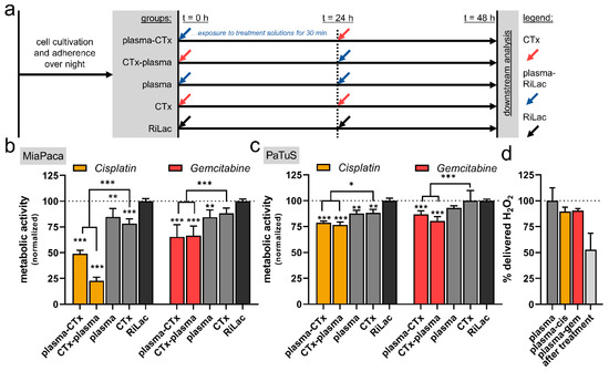 Additive decrease of metabolic activity using cisplatin or gemcitabine with physical plasma-conditioned Ringer’s lactate in pancreatic cancer cells. (a) Experimental procedure of the in vitro treatment regimens with the application of different treatment liquids (30 min exposure time; CTx = chemotherapeutic agents, plasma = physical-plasma-conditioned Ringer’s lactate, RiLac = Ringer’s lactate before the solutions were replaced with fresh cell culture medium) at 0 h and 24 h, as well as downstream analysis at 48 h; (b,c) the metabolic activity at 48 h of (b) MiaPaca and (c) PaTuS pancreatic cancer cells; (d) percent of the amount of H2O2 initially induced through the plasma treatment in the combinational regimen and post-exposure to plasma-conditioned RiLac. Data (b,c) are representatives out of eight independent experiments, or (d) representatives showing mean +SD. Statistical significance was calculated utilizing ANOVA.
