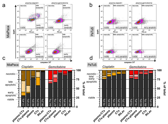 Combination of cisplatin and gemcitabine with physical plasma-conditioned Ringer’s lactate induced toxicity in pancreatic cancer cells. (a,b) representative gating of viable (DAPI-, caspase-), early apoptotic (DAPI-, caspase+), late apoptotic (DAPI+, caspase+) and necrotic (DAPI+, caspase-) MiaPaca (a) or PaTuS (b) cells at 48 h after exposure to plasma-CTx, CTx-plasma, or the corresponding Ringer’s lactate control (RiLac); (c,d) quantification of the percentage of viable, early and late apoptotic, or necrotic cells at 48 h for (c) MiaPaca and (d) PaTuS pancreatic cancer cells. Data are presented as mean and are representatives out of three independent experiments.
