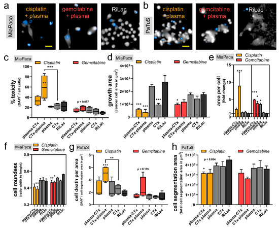 A combination of cisplatin and gemcitabine with physical plasma-conditioned Ringer’s lactate was toxic, reduced the cancer cells’ growth, and altered their morphology. (a) Representative images with the DAPI fluorescence channel and digital phase contrast of MiaPaca cells (scale-bar = 50 µm); (b) representative images with the DAPI fluorescence channel and digital phase contrast of PaTuS cell (scale-bar = 50 µm); (c–f) algorithm-based quantification of high-content imaging experiments showing (c) the toxicity (% DAPI+ events on all events), (d) the growth area (area of the pseudo-cytosolic digital phase contrast), (e) the area per cell, and (f) and roundness of MiaPaca pancreatic cancer cells; (g,h) algorithm-based quantification of (g) cell death (DAPI+ events per area) and (h) cell segmentation area of treated PaTuS cells. Imaging was performed at 48 h post initial exposure to the treatment liquids. Data are representative out of three independent experiments and are presented as (c,g) boxplot with their median ± min and max, or (e–h) as mean + SEM. Statistical significance was calculated utilizing ANOVA.