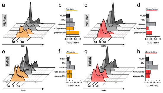 Different growth properties and morphological alterations can be indicative of cellular senescence that is induced by an arrest of the cell cycle. To address this question, the content of nucleic acid inside the cells was quantified by flow cytometry, and the ratio of cells in the G2 over the G1 phase was calculated. The single treatment with physical plasma-conditioned RiLac introduced the most drastic changes in cell cycle arrest, except for the treatment with plasma-cisplatin in MiaPaca cells (Figure 5a–h). However, also drug mono treatment (except gemcitabine in MiaPaca cells) elevate the number of the cells stuck in the G2 fraction. In addition, all combination therapies, with the exception of gemcitabine-plasma in Miapaca cells, showed elevated cell cycle arrest compared to the RiLac control (Figure 5a–h).