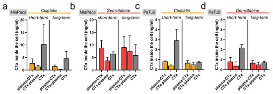 Next, we asked whether the exposition to plasma-conditioned RiLac alters the drug uptake and hence, the intracellular concentration of chemotherapeutic agents. To distinguish between acute effects, e.g., higher membrane penetrability (short-term), and prolonged effects, e.g., differences in expression or function of membrane transporter (long-term), the second treatment was performed with a latency of either 30 min or 24 h. First, it was found that the intracellular drug levels were higher in MiaPaca compared to PaTuS cells (Figure 6a–d). Secondly, short-term concentrations were always higher than long-term concentrations. Third, intracellular levels of cisplatin were generally above those of gemcitabine. These findings directly correlate with the toxic effects that were observed in our cytotoxicity studies. Plasma-treated RiLac reduced intracellular drug levels in MiaPaca cells, regardless of the sequence of combination therapy. For PaTuS, a similar effect was observed in the short-term conditions, while long-term conditions showed roughly equal levels in mono and combination treatments. This points to altered drug uptake or efflux from pancreatic cancer cells exposed to plasma-treated RiLac.