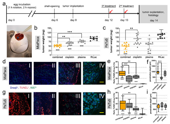 The combination of cisplatin with physical plasma-conditioned Ringer’s lactate showed additive toxicity in three-dimensional tumors grown on chicken embryos. (a) Schematic overview of in ovo experiments and image of treatment with liquids of three-dimensional pancreatic tumors grown on the chorion-allantois membrane of fertilized chicken eggs (TUM-CAM); (b,c) tumor weight quantified at 48 h post-treatment with Ringer’s lactate (RiLac), plasma-conditioned RiLac, cisplatin, or the combination of physical plasma-conditioned RiLac and cisplatin in MiaPaca (b) and PaTuS (c) tumors; (d,g) representative images of apoptotic MiaPaca (d) and PaTuS (g) cells (blue = Draq5+, red = TUNEL+, green = Ki67+; scale-bar = 100 µm) in cryo-sections of the tumors exposed to the combination treatment (I), cisplatin (II), plasma-RiLac (III) and RiLac alone (IV); (e,h) algorithm-based quantitative image analysis of the percentage of apoptotic cells (TUNEL+/Draq5+) in MiaPaca (e) and PaTuS (h) tumors; (f,i) penetration depth of the treatment regimen in MiaPaca (f) and PaTuS (i) tumors. Data are representative from two independent experiments with eight to thirteen eggs per group and show (b,c) individual values with their mean ± SD, and (e,f,h,i) median and min to max. Statistical significance was calculated utilizing ANOVA.