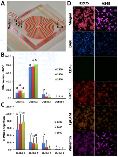 Optimization of Labyrinth for cell recovery. (A) The Labyrinth was loaded with red dye to show the device’s structure as well as the inlet and outlets. (B,C) Using the H1650 lung cancer cell line, different flow rates ranging from 2300–2500 μL/min were tested for inertial separation of cancer cells. Pre-labeled H1650 cell line and DAPI (4′,6-diamidino-2-phenylindole)-labeled white blood cells (WBCs) (1000 cells) were spiked into PBS and processed through the Labyrinth. Using a flow rate of 2500 μL/min, 82% ± 5% of H1650 cells were recovered from outlet #2 and 78% ± 18% of WBCs were removed through outlet #1. (D) Immunofluorescence staining optimization. Anti-human CD45 (cluster of differentiation 45) (green), anti-human PanCK (pan-Cytokeratin) (red), anti-human EpCAM (Epithelial cell adhesion molecule) (orange), and anti-human Vimentin (pink) antibodies were tested with lung cancer cell lines, H1975 and A549.
