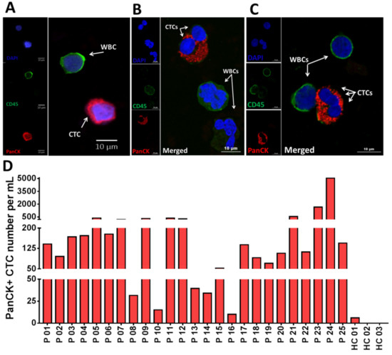 After CTC isolation, the product from outlet #2 was analyzed for CTCs. CTCs were detected by IF staining as described in the Materials and Methods. Cells with the PanCK+/CD45−/DAPI+ phenotype were identified and enumerated as CTCs. Figure 2A shows IF staining of an isolated single CTC stained positive for PanCK (red) and negative for CD45 (green) to distinguish CTCs from WBCs. Figure 2B,C illustrate confocal images of isolated CTCs in clusters of two (Figure 2B) and three cells (Figure 2C). We determined that all 25 patients (100%) had detectable CTCs with an average of 417 CTC/mL (10.2–5068) (Figure 2D). In contrast, low numbers of CTC/mL (0–3) were observed in the healthy controls (HCs, n = 3) (p = 0.0006) (Figure 2D and Figure S1) (Table S2).