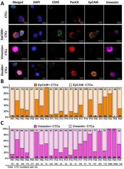 Figure 3B,C demonstrate the percentage of CTCs expressing EpCAM (EpCAM+/− in dark/light orange, respectively) and CTCs expressing Vimentin (Vimentin+/− in dark/light pink, respectively) from each patient. Of 23 patients, 17 demonstrated higher numbers of EpCAM− CTCs than EpCAM+ CTCs and six demonstrated higher numbers of EpCAM+ CTCs than EpCAM− CTCs. Of the captured CTCs among all patient samples (n = 23), 31% (96 CTCs/mL) were EpCAM+ CTCs, whereas 69% (336 CTCs/mL) were EpCAM− CTCs (p = 0.01) (Figure 3B and Figure S2A), 45% (346 CTCs/mL) were Vimentin+ CTCs and 55% (85 CTCs/mL) were Vimentin− CTCs (Figure 3C and Figure S2A).
