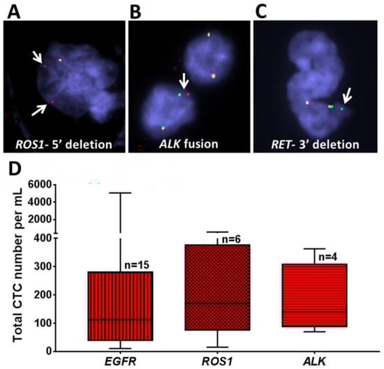 Genomic analysis of NSCLC patient samples using fluorescence in situ hybridization (FISH) analysis. (A–C) Recovered CTCs from selected patient samples with different mutations (ROS1, ALK, and RET) were evaluated. (A) A patient with ROS1 rearrangement showed 5′ deletion in some of the cells. (B) A patient with aberration in ALK showed ALK fusion. (C) A patient with aberration in RET showed 3′ deletion. Arrows indicate specific aberration in each gene. (D) Box plot of the total number of CTCs recovered from patients with different mutations (EGFR (n = 15), ROS1 (n = 6), and ALK (n = 4)). Analyses were conducted using GraphPad Prism.
