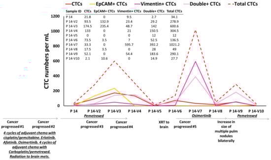 We have monitored CTC counts on therapy, and we have observed that CTC counts match patient’s outcomes. For example, ten consecutive samples from patient P 14 were collected during different treatment regimens. The numbers of CTCs were analyzed during follow-up visits (Figure 6). This patient enrolled on this study following progression of her cancer after initially receiving four cycles of adjuvant chemotherapy with cisplatin/gemcitabine. She was noted to have an EGFR mutation and subsequently underwent therapy with erlotinib, afatinib, osimertinib (various tyrosine kinase inhibitors due to tolerability of therapy). Following further progression, she received chemotherapy with carboplatin/pemetrexed as well as radiation to brain metastasis. She was then placed on chemotherapy with pemetrexed. Higher numbers of CTCs were observed in her 2nd and 3rd visits compared to 1st visit (reflecting progression of her cancer on therapy). After 183 days (visits 3–4), her brain MRI showed an interval increase in the size of lesions at the junction of L frontal/parietal lobes and a new 5 mm lesion in L posterior fossa. She underwent stereotactic radiation to the brain lesions. However, at 238 days, she continued to show further progression in the brain. Her CTC counts increased at these visits compared to the previous follow-up visits. After 400 days the brain MRI showed response to treatment. Mild reduction in the size of known supra and infratentorial metastatic lesions and reduced degree of associated edema was observed. Her CTC counts were dropped drastically. After 425 days CT on chest showed subtle growth of several lung nodules consistent with metastatic disease progression. Her CTC counts increased again, in keeping with this thoracic progression and the counts continued to increase until she was placed on pemetrexed chemotherapy, when the CTC counts dropped. In summary, according to the available clinical information, the CTC numbers tracked the patient’s outcome over the course of treatment.