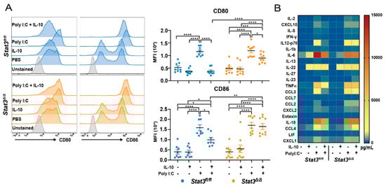 Evaluation of Signal Transducer and Activator of Transcription 3 (STAT3) function in CD103+ type 1 conventional dendritic cell (cDC1) maturation. In vitro-generated, fluorescence activated cell sorting (FACS)-purified Stat3-sufficient (Stat3fl/fl) or -deficient (Stat3∆/∆) CD103+ cDC1s were stimulated with or without 10 ng/mL murine interleukin (IL)-10, 20 μg/mL polyinosinic:polycytidylic acid (poly I:C), or 10 ng/mL IL-10 and 20 μg/mL poly I:C for 16 hours (h), as indicated. (A) Representative flow cytometry plots (left) and cumulative data (right) of cell surface expression of co-stimulatory markers on CD103+ cDC1s following the indicated treatment. n = 8 (Stat3fl/fl), n = 9 (Stat3∆/∆) for all conditions, combined from 4 independent experiments. (B) Mean cytokine and chemokine abundance in cell culture supernatants from (A), determined by multiplex analysis; cytokines and chemokines that were not detected within observable limits are not shown. n = 4 (phosphate buffered saline, PBS), n = 5 (IL-10), n = 6 (poly I:C), n = 6 (poly I:C + IL-10) for both genotypes, combined from 4 independent experiments. Data shown in panel (A) (right) represent mean ± S.E.M. (A) results analyzed by two-way ANOVA and Bonferroni’s multiple comparison test, comparing all treatments within each genotype, and comparing the two genotypes within a given treatment. Results were considered significant when p < 0.05. * p < 0.05; ** p < 0.01; *** p < 0.001; **** p < 0.0001.
