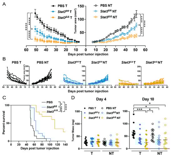 Efficacy of Stat3-deficient CD103+ cDC1 vaccine in murine breast cancer. Mice bearing bilateral Polyomavirus middle T-antigen (PyMT) tumors, engineered to overexpress ovalbumin (OVA, PyMT-OVA) received intratumoral (i.t.) injection of PBS, the Stat3fl/fl CD103+ cDC1 vaccine, or the Stat3∆/∆ CD103+ cDC1 vaccine in right side tumors only, 7 days (d) after tumor establishment. (A) Representative mean tumor size (mm2) of treated (T) and non-treated (NT) tumors, from one of two independent experiments. (B) Individual tumor sizes (mm2) from (A). (A,B) n = 7 (PBS), n = 7 (Stat3fl/fl), n = 8 (Stat3∆/∆). (C) Cumulative mouse survival from two independent experiments. n = 14 (PBS), n = 14 (Stat3fl/fl), n = 16 (Stat3∆/∆). (D) Tumor mass (mg) on the indicated day following i.t. PBS or CD103+ cDC1 vaccine injection; cumulative results from three independent experiments shown. Left panels, day 4; n = 15 (PBS T, NT; Stat3fl/fl T, NT; Stat3∆/∆ NT), n = 16 (Stat3∆/∆ T). Right panels, day 10; n = 14 (PBS T, NT), n = 15 (Stat3fl/fl T, NT; Stat3∆/∆ T, NT). (A,D) Data shown are the mean ± S.E.M. Results analyzed by two-way ANOVA (A) or one-way ANOVA and Tukey’s multiple comparisons test (D). (C) Data analyzed by log-rank (Mantel–Cox) test. Results were considered significant when p < 0.05. * p < 0.05; *** p < 0.001; **** p < 0.0001.