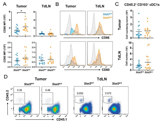 To evaluate mechanisms by which Stat3∆/∆ CD103+ cDC1s improved control of PyMT mammary tumors, we examined the maturation state of CD103+ cDC1s post-vaccination. Congenic CD45.1+ mice bearing bilateral PyMT-OVA tumors were vaccinated with CD45.2+ Stat3fl/fl or Stat3∆/∆ CD103+ cDC1s, and subsequently analyzed for vaccine-derived CD45.2+ CD103+ cDC1s 40 hours (h) following vaccination. We found increased expression of CD86 on tumor-associated, vaccine-derived Stat3∆/∆ CD103+ cDC1s compared to Stat3fl/fl CD103+ cDC1s, as judged by relative CD86 amounts on CD45.2+ CD103+ cDC1s (Figure 3A,B). In addition, CD80 and MHC II appeared to be increased on vaccine-derived Stat3∆/∆ CD103+ cDC1s in the TME, relative to vaccine-derived Stat3fl/fl CD103+ cDC1s, although these data did not reach statistical significance (Figure 3A,B and Figure S3A). By contrast, STAT3 did not affect expression of CD86, CD80, or MHC II on vaccine-derived CD103+ cDC1s within tumor-draining lymph nodes (TdLNs) (Figure 3A,B and Figure S3A). Furthermore, STAT3 did not alter the amounts of vaccine-derived CD103+ cDC1s in mammary tumors or TdLNs, as judged by equivalent numbers of CD45.2+ Stat3fl/fl and CD45.2+ Stat3∆/∆ CD103+ cDC1s detected in each site (Figure 3C,D). Notably, Stat3fl/fl and Stat3∆/∆ CD45.2+ CD103+ cDC1s were found only in the vaccinated tumors and corresponding TdLNs (Figure S3B), suggesting they did not migrate to the unvaccinated tumor or distal TdLN. Taken together, these results indicate STAT3 inhibits CD86 expression in CD103+ cDC1s within the murine breast TME but does not affect CD103+ cDC1 retention in tumors or CD103+ cDC1 migration to TdLNs.
