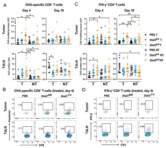 T cell responses after vaccination with Stat3-deficient CD103+ cDC1s. T cell subsets were analyzed in tumors and TdLNs 4 d and 10 d following i.t. vaccination of mice bearing bilateral PyMT-OVA tumors with Stat3fl/fl CD103+ cDC1s, Stat3∆/∆ CD103+ cDC1s or PBS. (A) Cumulative amounts and (B) representative flow cytometry plots of OVA-specific CD8+ T cells (identified by SIINFEKL/H2-Kb pentamer staining) (CD45+ CD3+ CD4− CD8+ Pentamer+) within tumors and TdLNs on 4 d and 10 d following vaccination, as indicated. Data shown are from two independent experiments (A). Tumors, d 4, n = 11 for all groups; TdLNs, d 4, n = 11 (Stat3fl/fI T, NT; Stat3∆/∆ T; PBS NT), n = 10 (PBS T, Stat3∆/∆ NT). Tumors, d 10, n = 10 (PBS T, NT; Stat3fl/fI NT), n = 11 (Stat3fl/fl T), n = 7 (Stat3∆/∆ T), n = 8 (Stat3∆/∆ NT). TdLNs, d 10, n= 10 (PBS T, NT), n = 11 (Stat3fl/fl T, NT; Stat3∆/∆ T, NT). (C) Cumulative amounts and (D) representative flow cytometry plots of IFN-γ+ CD4+ T cells (CD45+ CD3+ CD8− CD4+ IFN-γ+) within tumors and TdLNs on 4 d and 10 d following vaccination, as indicated. Data shown are from three independent experiments (C). Tumors, d 4, n = 15 (PBS T, NT; Stat3fl/fl NT; Stat3∆/∆ T, NT), n = 16 (Stat3fl/fl T). TdLNs, d 4, n = 15 for all groups. Tumors, d 10, n = 14 (PBS T, NT), n = 15 (Stat3fl/fl T), n = 11 (Stat3∆/∆ T), n = 13 (Stat3fl/fl NT), n = 12 (Stat3∆/∆ NT). TdLNs, d 10, n = 13 (PBS T), n = 14 (PBS NT), n = 15 (Stat3fl/fl T, NT; Stat3∆/∆ T, NT) (A,C) Data shown are the mean ± S.E.M. Data analyzed by one-way ANOVA and Tukey’s multiple comparisons test. Results were considered significant when p < 0.05. * p < 0.05; ** p < 0.01.