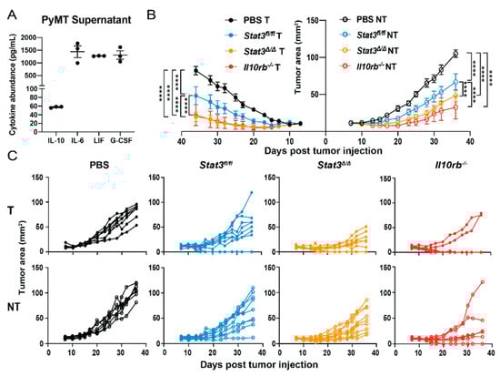 Efficacy of IL-10 receptor β subunit-deficient (Il10rb−/−) CD103+ cDC1 vaccine in murine breast cancer. (A) Cytokine amounts in PyMT-OVA culture supernatant determined by multiplex analyses. Data are from three independent experiments, n = 3. (B,C) Bilateral PyMT-OVA tumor-bearing mice received i.t. injection of PBS, the Stat3fl/fl CD103+ cDC1 vaccine, the Stat3∆/∆ CD103+ cDC1 vaccine, or the Il10rb−/− CD103+ cDC1 vaccine in right side tumors only, 7 d after tumor establishment. (B) Representative mean tumor size (mm2) from one of two independent experiments. (C) Individual tumor sizes from (B), n = 7 (PBS, Il10rb−/−), n = 9 (Stat3fl/fl, Stat3∆/∆). (A,B) Data shown are the mean ± S.E.M. (B) Data analyzed by two-way ANOVA and Tukey’s multiple comparisons test. Results were considered significant when p < 0.05. **** p < 0.0001.