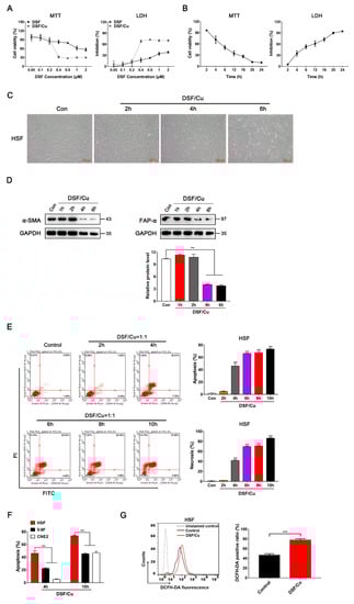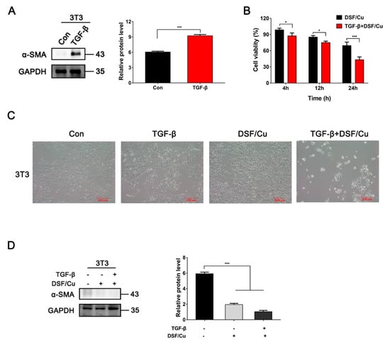 2.5. DSF/Cu Reduces the Viability of Fibroblasts and Attenuates Fibroblast Activation