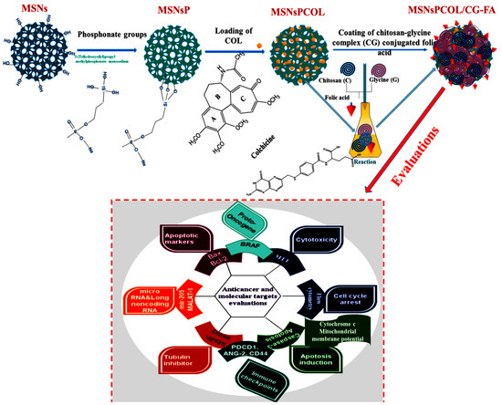 The targeted drug delivery system for COL, MSNsPCOL/CG-FA, comprised COL-loaded MSNsP subsequently coated with chitosan-glycine conjugated to folic acid. The schematic representation of the process is shown in Figure 1.