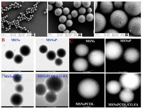 To observe the structural changes between the prepared materials, we used TEM STEM and FE-SEM techniques. The FE-SEM images (Figure 2A) show the 3D dendritic mesoporous structure of MSNs with a spherical shape that is uniform in size. No aggregation was seen. In TEM images (Figure 2B), there were no detectable differences between MSNs, MSNsP, and MSNsPCOL. However, in MSNsPCOL/CG-FA, the central part appeared gray-white in color due to the coating complex (chitosan-glycine). This observation is similar to that seen in STEM images, where MSNsPCOL/CG-FA was white in color (Figure 2C). Thus, the coating was confirmed by STEM and TEM observations.