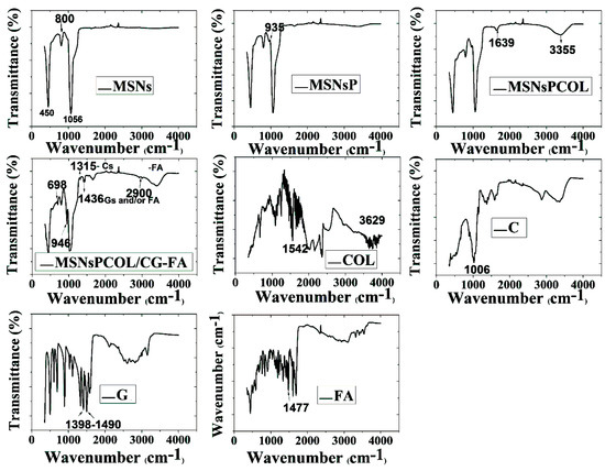 FTIR was used to identify surface functional groups (Figure 3). MSNs had several peaks at 450, 800, and 1056 cm−1 because of the siliceous mesostructured framework. As their surface was functionalized with phosphonate groups in MSNsP, we observed a new band at 953 cm−1 and a broad peak from 3000 to 3600 cm−1, reflecting phosphonate groups [39]. Two new peaks at 1639 cm−1, and an intensive peak centered at 3355 cm−1 were presented in MSNsPCOL, corresponding to shifted peaks at 1542 and 3629 cm−1 for COL. Additional coating resulted in several new peaks, with bands at 698 and 946 cm−1 attributed to chitosan, glycine, or folic acid. A band at 1315 cm−1 could correspond to chitosan, a band at 1436 cm−1 could correspond to either chitosan or folic acid, but a band at 2900 cm−1 could correspond to folic acid. A peak centered at 1034 cm−1 became broader, which ascribes all components for coating.