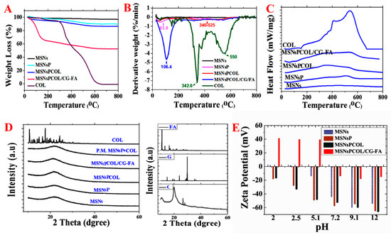 The results of the DTG thermograms in Figure 4B are consistent with STA, providing clear data that confirm the degradation. In MSNsP, a peak at 63 °C showed moisture, and another at 500 °C was attributed to organic decomposition. The degradation of COL was confirmed with the peak in the range of 340 to 525 °C in MSNsPCOL based on the two maximum peaks at 342 °C and 550 °C for free COL. A peak recorded at 106 °C in MSNsPCOL/CG-FA corresponded to decomposition of the coating material.