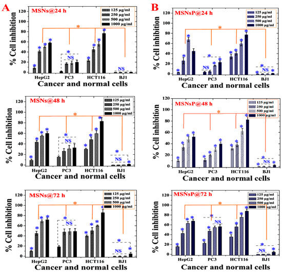 In vitro cytotoxicity (as percent inhibition) of MSNs and MSNs functionalized with phosphonate functional groups (MSNsP) for biocompatibility evaluations in cancer and normal cell lines after 24, 48, and 72 h of incubation with cancer cells (liver, HepG2; prostate, PC3; and colon, HCT116) and normal fibroblasts (BJ1). (A) Cytotoxicity of MSNs towards cell lines. (B) Cytotoxicity of MSNsP towards cell lines. Note: A blue asterisk (*) indicates significant (p < 0.05) differences between tested concentrations, whereas an orange asterisk (*) indicates significant differences between cell lines. NS, not significant. All data are expressed as mean ± SD.