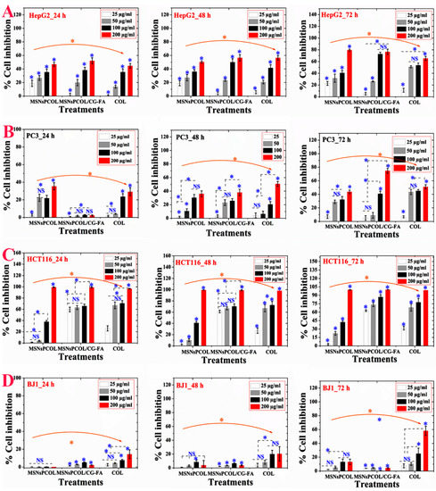 In vitro cytotoxicity (as percent inhibition) of the proposed delivery system in cancer and normal cells after 24, 48, and 72 h of incubation with cells. (A) Anticancer effects on HepG2 cancer cells. (B) Anticancer effects on PC3 cancer cells. (C) Anticancer effects on HCT116 cancer cells. (D) Anticancer effects on BJ1 normal cells. Note: A blue asterisk (*) indicates significant (p < 0.05) differences between tested concentrations, whereas an orange asterisk (*) indicates significant differences between tested samples (nanoformulations and COL). NS, not significant. All data are expressed as mean ± SD.