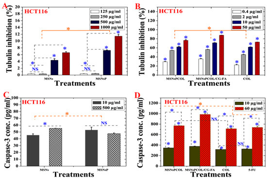 (A) Tubulin inhibition activity of HCT116 cells treated with MSNs and MSNsP as a function of concentration. (B) Tubulin inhibition activity HCT116 cells treated with the proposed delivery system as a function of concentration. (C) Caspase-3 activity of HCT116 cells treated with MSNs and MSNsP as a function of concentration. (D) Caspase-3 activity of HCT116 cells treated with the proposed delivery system and compared to the model anticancer drug (5-FU) as a function of concentration. Note: A blue asterisk (*) indicates significant (p < 0.05) differences between tested concentrations, whereas an orange asterisk (*) indicates significant differences between tested samples. NS, not significant. All data are expressed as mean ± SD.