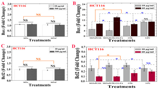 Though MSNs and MSNsP had not significant effect, they slightly inhibited BCL-2 ~1.2 FLD (Figure 8C). As shown in Figure 8D, the inhibition of BCL-2 was affected by concentration. Treatment of cells at 10 μg/mL resulted in low inhibition and ranked in effect as follows: MSNsPCOL and 5-FU (>0.2 FLD) > MSNsPCOL/CG-FA and COL (~0.35 FLD). Upon further increasing the concentration to 60 μg/mL, BCL-2 highly inhibited to ~0.1 FLD (for MSNsPCOL/CG-FA and MSNsPCOL), <0.2 FLD (for COL), and ~0.2 FLD. These findings show significantly better molecular targeting of nanoformulations in HCT116 cells via Bax enhancement and BCL-2 inhibition than free COL and 5-FU. Furthermore, this effect strongly requires efficient upregulation of Bax and down-regulation of BCL-2, allowing progression of the apoptotic pathway in HCT116 cancer cells. Inhibition of BCL-2 is important because it is considered a potent death suppressor protein; it promotes cell survival by blocking apoptosis and is upregulated in several cancers. BCL-2 is classified as an anti-apoptotic protein in many cancers, including colorectal cancer [61,62], inducing cancer resistance to drugs. Bax is a pro-apoptotic protein that promotes apoptosis in cells but is always present in inactivated states in many cancers, including colon cancer [57,63]. Therefore, these results confirm that the enhancement of apoptosis by MSNsPCOL/CG-FA interconnects with reduced Bcl-2 and increased Bax.