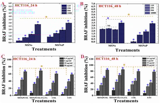 BRAF inhibition was concentration- and time-dependent. MSNs and MSNsP (at 1000 µg/mL) reduced BRAF ~3% to 3.5% for cells incubated for 24 and 48 h, respectively (Figure 9A,B). Significant inhibition of BRAF was dependent on concentration, time, and delivery route (Figure 9C,D). It was decreased in cells incubated for a longer time. For example, at 50 µg/mL treatment, the inhibition was ~90%, ~87%, ~82%, and ~80% with MSNsPCOL/CG-FA, MSNsPCOL, COL, and 5-FU, respectively. This pattern shows that MSNsPCOL/CG-FA is efficient in inhibiting BRAF in HCT116 cells. Our findings on MSNsPCOL/CG-FA confirm the killing of HCT116 cancer cells was enhanced through apoptosis mechanisms.