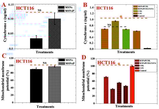 (A) Cytochrome c triggering of HCT116 cells treated with MSNs and MSNsP at 500 µg/mL. (B) Cytochrome c triggering of HCT116 cells treated at 60 µg/mL with the proposed delivery system for 72 h and compared to the model anticancer drug (5-FU) and control (without any treatment). (C) Mitochondrial membrane potential (Δψm) of HCT116 cells treated with MSNs and MSNsP at 500 µg/mL. (D) Mitochondrial membrane potential of HCT116 cells treated at 60 µg/mL with the proposed delivery system for 72 h and compared to the model anticancer drug (5-FU) and control. Note: An orange asterisk (*) indicates significant (p < 0.05) differences between tested samples. NS, not significant. All data are expressed as mean ± SD.