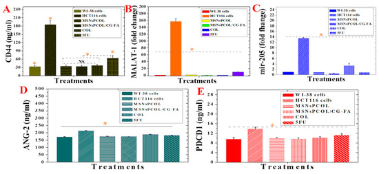 (A) MALAT-1 protein expression in normal WI-38 cells, HCT116 cells, and HCT116 cells treated with proposed delivery and 5-FU. (B) mir-205 expression in normal WI-38 cells, HCT116 cells, and HCT116 cells treated with proposed delivery and 5-FU. (C) Ang-2 protein expression in normal WI-38 cells, HCT116 cells, and HCT116 cells treated with proposed delivery and 5-FU. (D) CD44 protein expression in normal WI-38 cells, HCT116 cells, and HCT116 cells treated with proposed delivery and 5-FU. (E) PD-1 protein expression in normal WI-38 cells, HCT116 cells, and HCT116 cells treated with proposed delivery and 5-FU. Note: An orange asterisk (*) indicates significant (p < 0.05) differences between tested samples, whereas a blue asterisk (*) indicates significant differences between specific samples. NS, not significant. All data are expressed as mean ± SD.