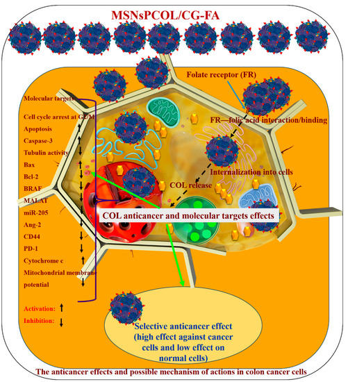 In summary, the main findings in the current study were enhancement of the antimitotic effects of COL by means of a targeted delivery system (MSNsPCOL/CG-FA). The enhanced antimitotic effects block cancer cell growth due to the binding of COL to tubulin in cells, leading to cell death. The main mechanism of action is an apoptosis cell death mechanism through different molecular pathways known for COL action on cancer cells. In addition, genetic regulation and immunotherapeutic effects have a role. A schematic representation of the nanoformulation mechanism of action is shown in Figure 12, and Table 2 outlines the results of the current study. The following factors explain the feasibility of cancer-targeting via folate receptors using folic acid ligands as developed here: