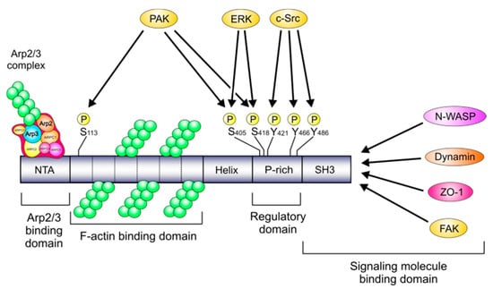 - Schnoor, M.; Stradal, T.E.; Rottner, K. Cortactin: Cell functions of a multifaceted actin-binding protein. Trends Cell Biol. 2018, 28, 79–98. [Google Scholar] [CrossRef]