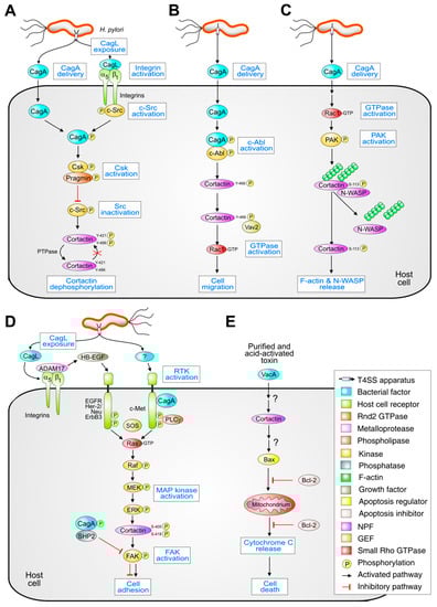 - Selbach, M.; Moese, S.; Hurwitz, R.; Hauck, C.R.; Meyer, T.F.; Backert, S. The Helicobacter pylori CagA protein induces cortactin dephosphorylation and actin rearrangement by c-Src inactivation. EMBO J. 2003, 22, 515–528. [Google Scholar] [CrossRef]