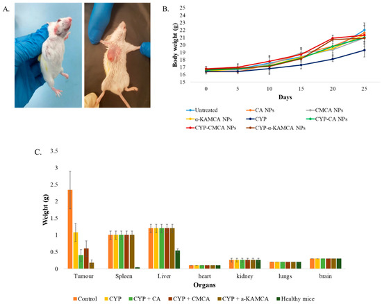 Conventional anticancer drugs are administered frequently in a high dose to maintain an adequate amount of drug available in the tumor site as the drugs are not target-specific, triggering adverse side effects due to toxicity to the healthy tissues. It is, therefore, desirable for NPs to deploy the cargo predominantly to the tumor site to maximize the therapeutic benefits and eliminate it from the body within a certain period of time [47]. To reveal the potential antitumor efficacy of CYP-loaded NPs in breast cancer therapy, a murine breast cancer model was established (Figure 2A) and treated with empty CA NPs, CMCA NPs, and α-KAMCA NPs, as well as various CYP-loaded NPs and a free CYP solution (0.3 mg/kg body weight (BW)) (Figure 2B). While none of the particles with or without drugs interfered with gradual body weight gain, free CYP significantly slowed the gain in comparison to the untreated group, indicating that free CYP, even at a low dose, was highly toxic to the animals, while neither empty NPs nor CYP-loaded NPs possessed any visible toxicity.