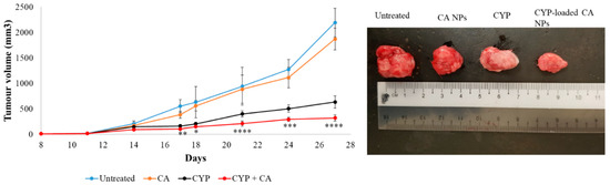 Treatment effects of free CYP, CYP-loaded CA NPs, and drug-free CA NPs compared to the untreated group of mice. Tumor picture was taken at day 27 after the mice were sacrificed humanely via euthanasia. Values were significant (*) at a p-value of 0.01 to 0.05, very significant (**) at a p-value of 0.001 to 0.01, highly significant (***) at a p-value of 0.0001 to 0.001, and extremely significant (****) at a p-value < 0.0001 vs. the same treatment with free CYP at a confidence interval (CI) of 95%.