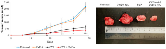 Treatment effects of free CYP, CYP-loaded CMCA NPs, and drug-free CMCA NPs compared to the untreated group of mice. Tumor picture was taken at day 27 after the mice were sacrificed humanely via euthanasia. Values were significant (*) at a p-value of 0.01 to 0.05, very significant (**) at a p-value of 0.001 to 0.01, and highly significant (***) at a p-value of 0.0001 to 0.001 vs. the same treatment with free CYP at a CI of 95%.