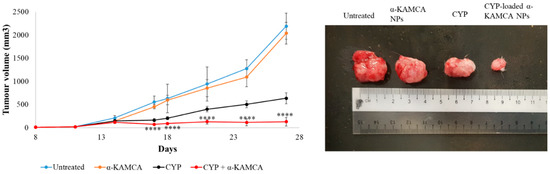 Treatment effects of free CYP, CYP-loaded α-KAMCA NPs, and drug-free α-KAMCA NPs compared to the untreated group of mice. Tumor picture was taken at day 27 after the mice were sacrificed humanely via euthanasia. Values were extremely significant (****) at a p-value < 0.0001 vs. the same treatment with free CYP at a CI of 95%.