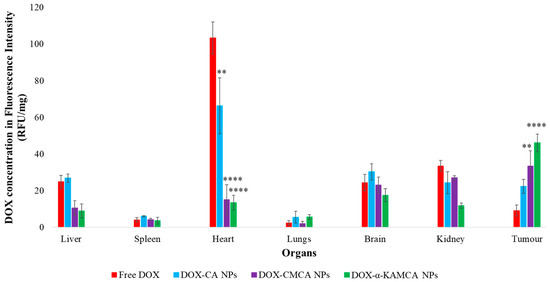 Biodistribution of free DOX, DOX-loaded CA NPs, DOX-loaded CMCA NPs, and DOX-loaded α-KAMCA NPs in the 4T1 murine breast cancer cell line-induced tumor mouse model at 24 h of treatment. Values were significant (*) at a p-value of 0.01 to 0.05, very significant (**) at a p-value of 0.001 to 0.01, and extremely significant (****) at a p-value <0.0001 vs. the same treatment with free DOX at a CI of 95%.