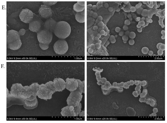 Field emission (FE)-SEM characterization was performed to analyze the surface property, size, and the binding nature of CYP-loaded CA, α-KAMCA, and CMCA NPs, as well as DOX-loaded CA, α-KAMCA, and CMCA NPs (Figure 9). CYP-loaded CA NPs and DOX-loaded CA NPs formed a huge number of spherical-shaped particles with an average size of 251–314 nm and 349–429 nm, respectively (Figure 9A,B). The sizes of CYP-loaded α-KAMCA NPs and DOX-loaded α-KAMCA NPs were around 213–258 nm and 180–212 nm (Figure 9C,D), respectively, with globular shape, and they possessed a more folded surface than the drug-loaded CA NPs, resulting in a large surface area for an efficient amount of drug binding. Interestingly, DOX-loaded α-KAMCA NPs formed branched nanoclusters with numerous tiny particles of around 15–25 nm. However, the sizes of CYP- and DOX-loaded CMCA NPs were in the range of 401–436 nm with a heterogeneous particle shape and size distribution. The size and morphology of CMCA NPs remained unchanged regardless of the drug molecules bound to the particles (Figure 9E,F).