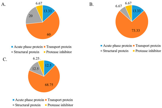 Figure 10 and Table 8, Table 9 and Table 10 show the distribution of proteins in the corona where transport proteins made up the largest segment of the protein corona with 60%, 73.33%, and 68.75% for CA, CMCA, and α-KAMCA NPs, respectively, including albumin proteins, which are the most abundant proteins in plasma (also known as dysopsonins that inhibit opsonization), followed by immunoglobulins and coagulation proteins responsible for the alteration of NP opsonization, allocation, and targeting efficiency [50,51,52]. The constituents of the protein corona, shown in the abovementioned figure and tables, display an abundance of transport proteins, including several albumin proteins, but a lack of immunoglobulins, coagulation factors, globulins, complement proteins, and fibrinogen. CA, CMCA, and α-KAMCA NPs were found to bind acute-phase proteins at almost 13.33%, 13.33%, and 12.5%, respectively, which may contribute to opsonization. This finding was further supported by the distribution of NP-encapsulated DOX in the tissues enriched with RES such as the liver, lungs, and spleen (Table 3). Furthermore, the presence of apolipoprotein in the NPs [53] suggests that drug-loaded NPs could be easily taken up by the brain endothelial cells.