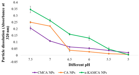 2.7. Dissolution Study of CA, CMCA, and α-KAMCA NPs at Different pH